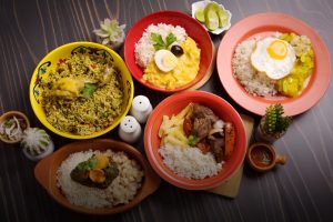 - Ingredientes: Arroz branco, batatas fritas, frango frito e uma variedade de molhos para acompanhar.